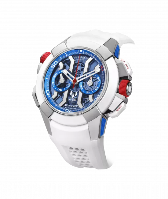 | Movement: | Calibre: Exclusivo Cronógrafo Bi-Compax de rueda de pilares semiesqueleto, automático Jacob&Co JCAA05 Diámetro: 30,40mm Altura: 8,40mm Componentes: 260 Funciones: Horas, Minutos, Segundos (Indicador de segundero pequeño en |