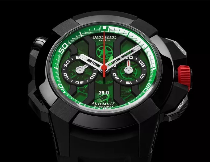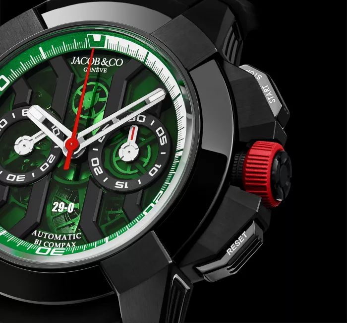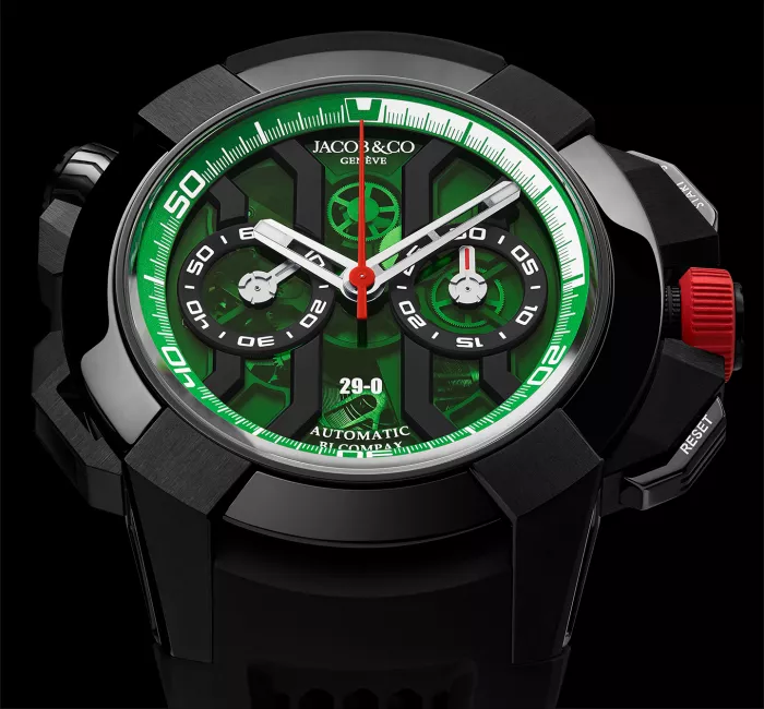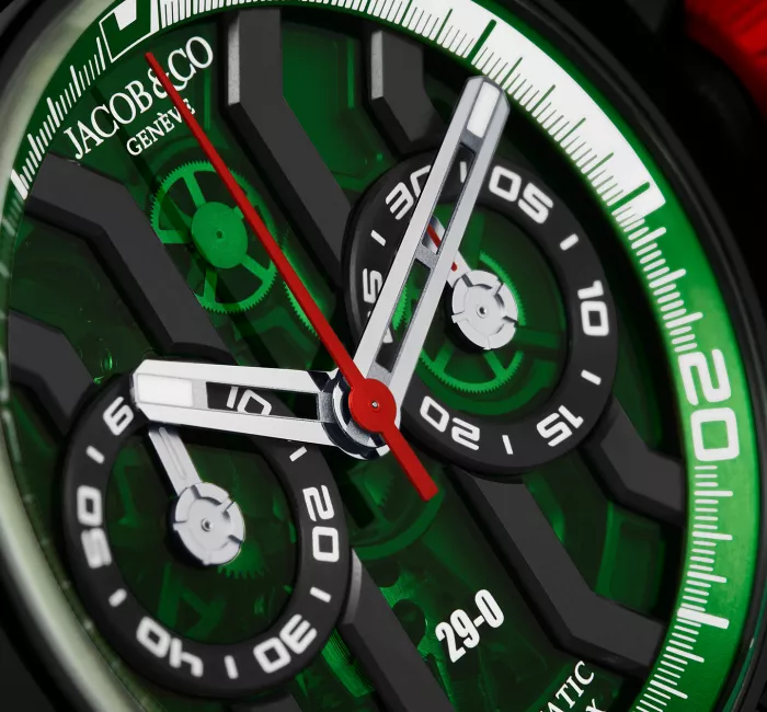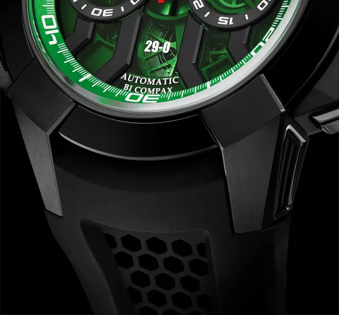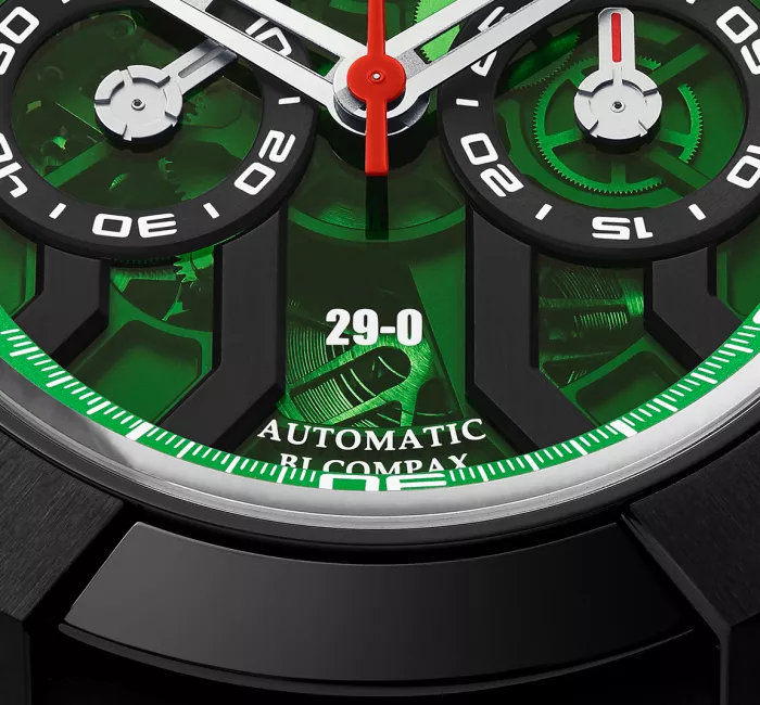 | Dial & Hands: | Esfera: Cristal mineral verde con logotipo "29-0"; anillos interiores de aluminio anodizado satinado negro; agujas: Esqueleto con SuperLuminova blanca; agujas de cronógrafo rojas. |