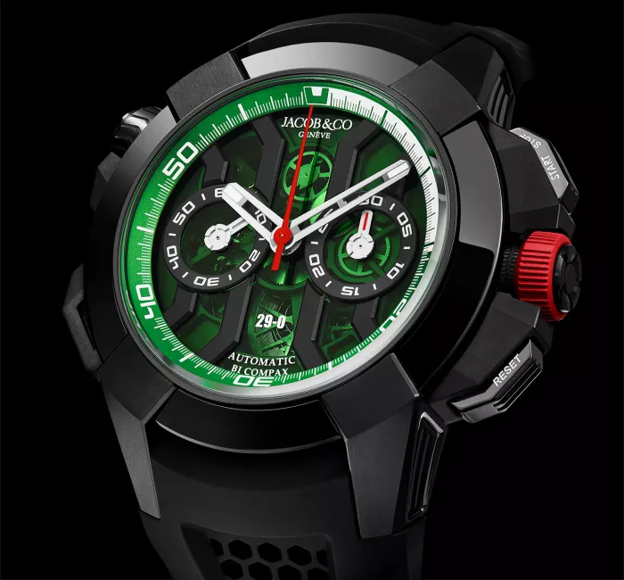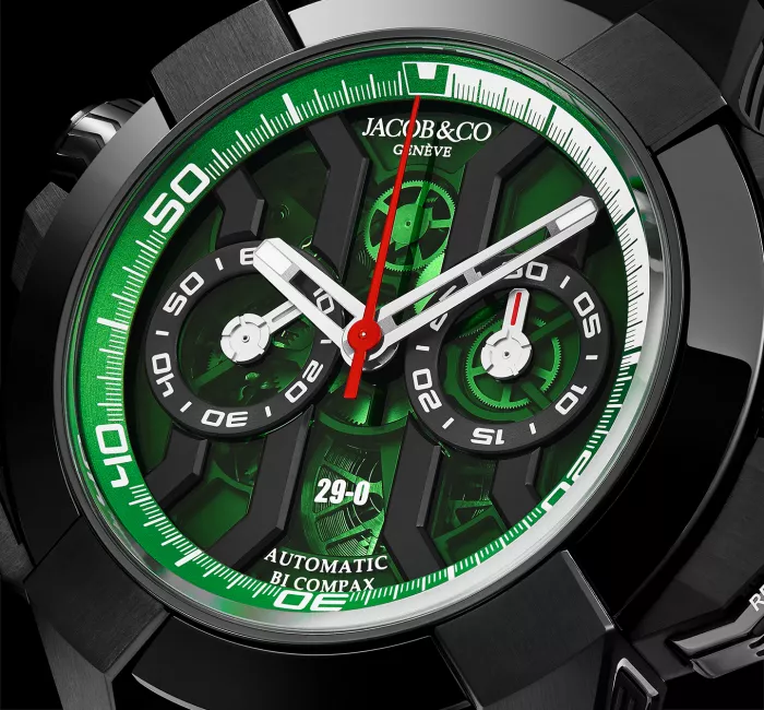 | Movement: | Exclusivo Cronógrafo Esqueleto Bi-Compax; Automático Jacob & Co JCAA05; Diámetro: 30,40mm; Altura: 8,40mm; Componentes: 260; Funciones: Horas, Minutos; Minutos, Segundos Cronógrafo; Pequeño indicador de segundos a las 9 horas; Contador de minutos a las 3 horas; Anillo giratorio interno del bisel; Aguja del cronógrafo centrada; Reserva de marcha: 48 horas |