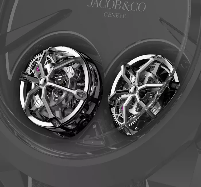 Le calibre JCFM10 comporte une paire de tourbillons volants à haute vitesse, séquentiels, à triple axe. Chacun d’entre eux tourne le long de trois axes différents. Chaque axe entraîne une cage séparée. La première, la plus extérieure, fait un tour complet en 180 secondes, la deuxième en 24 secondes et la troisième, la plus proche du balancier 3 Hz, en 48 secondes. Par rapport à la rotation traditionnelle d’une minute d’un tourbillon plat, et à de nombreux tourbillons multi-axes, 24 et 48 secondes sont des chiffres très élevés. Cela explique pourquoi Jacob & Co. les appelle des tourbillons à grande vitesse.