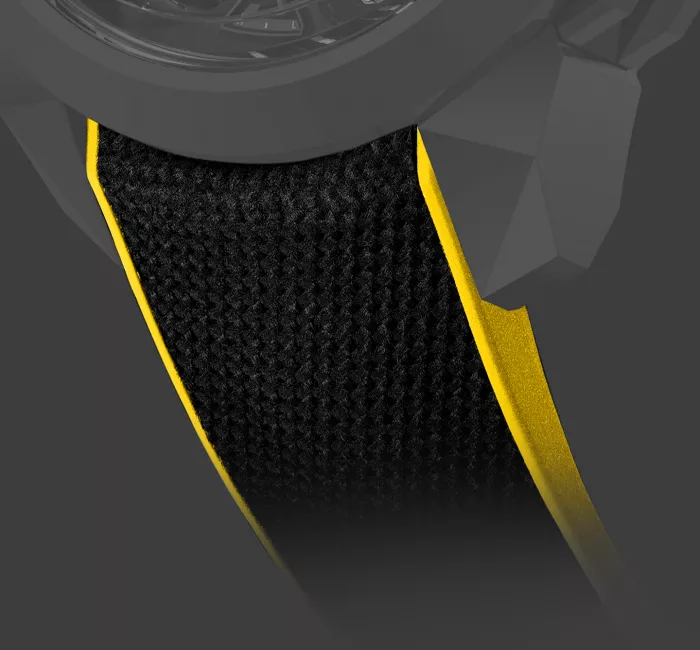 La dernière partie de l’ensemble des traits de conception de l’hommage à Gotham City est le bracelet en caoutchouc qui le fixe. Ce dernier hommage à Batman est une allusion directe à la couleur jaune et noire du cadran. La partie en contact avec la peau est en caoutchouc jaune texturé. Sa surface a été conçue pour améliorer le confort et la facilité de port.